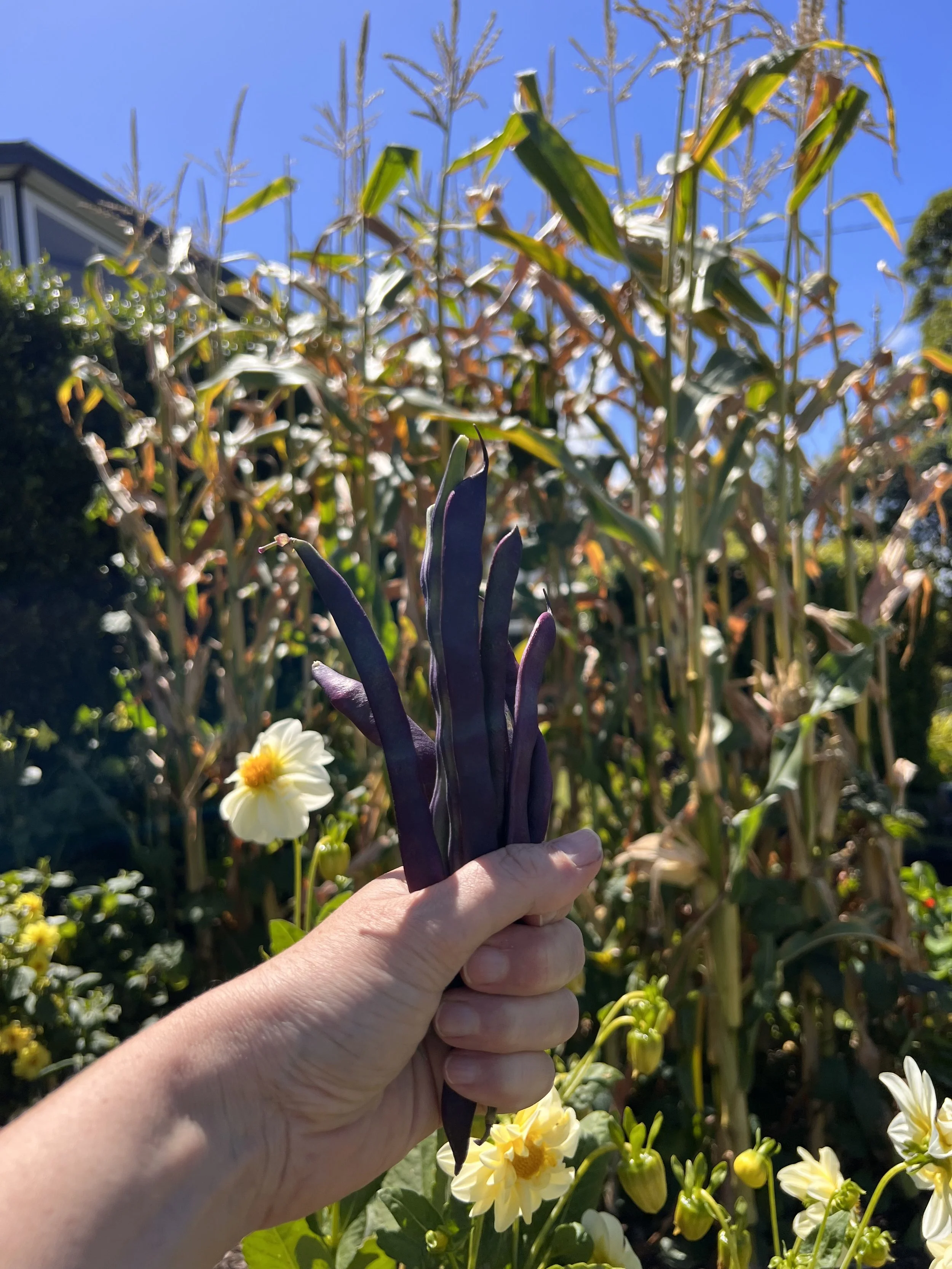 Corn are finished but are being used as a sturdy trellis for the Purple King beans.